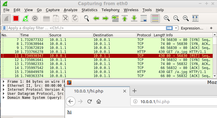 From the following figure, we can tell the connection will be reset. The Firefox will reconnect to the server again to get the hi.php.