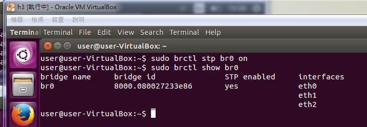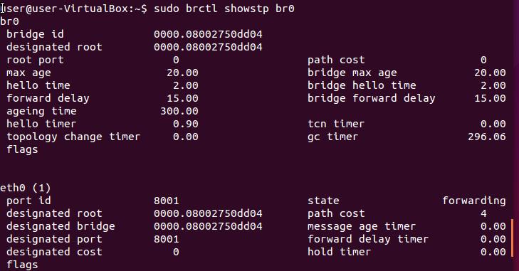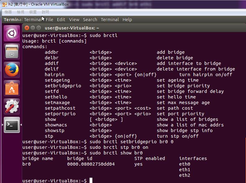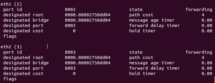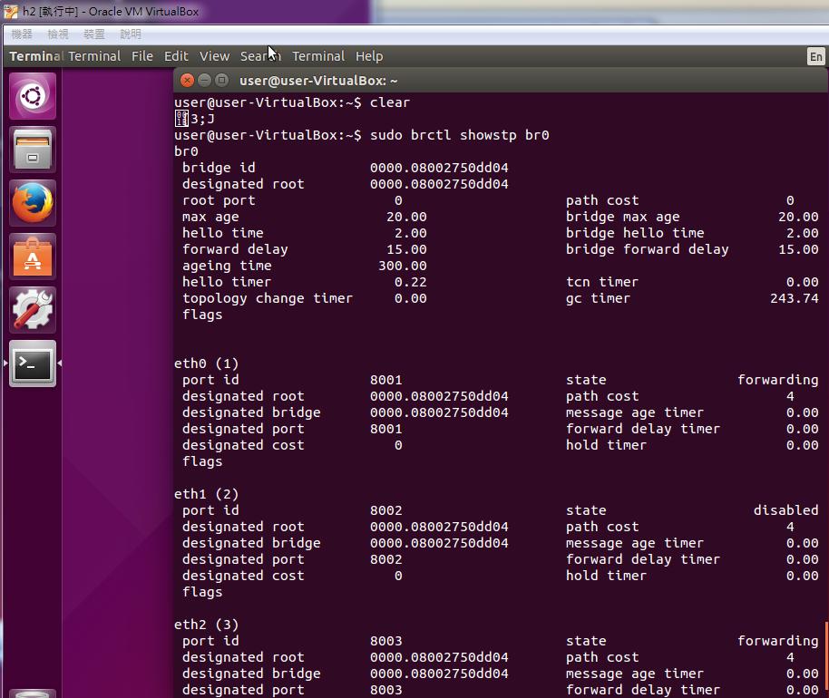 10. Turn on the stp in h2 and set the h2 as the root bridge. (See the first part of bridge id. The smaller value, the higher priority.)
