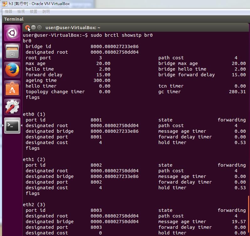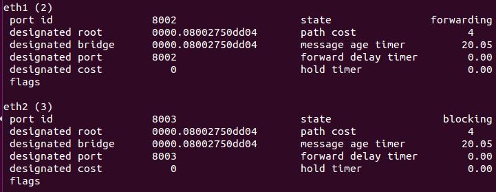 14. Check the status of h3. (we can see that the port 3 (ether2) is blocked due to stp).